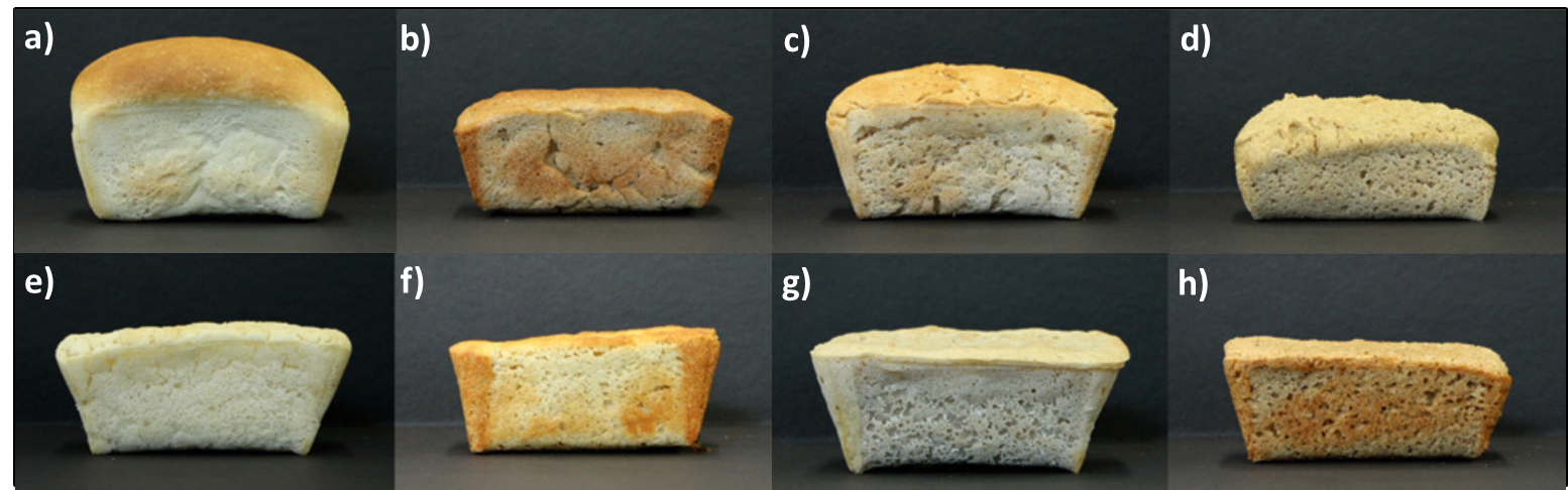 Všechny chleby byly připraveny podle stejného standardního receptu s použitím droždí, metodou přímého vedení těsta. a) pšenice b) žito c) ječmen 4) oves 5) rýže 6) kukuřice 7) pohanka 8) proso
