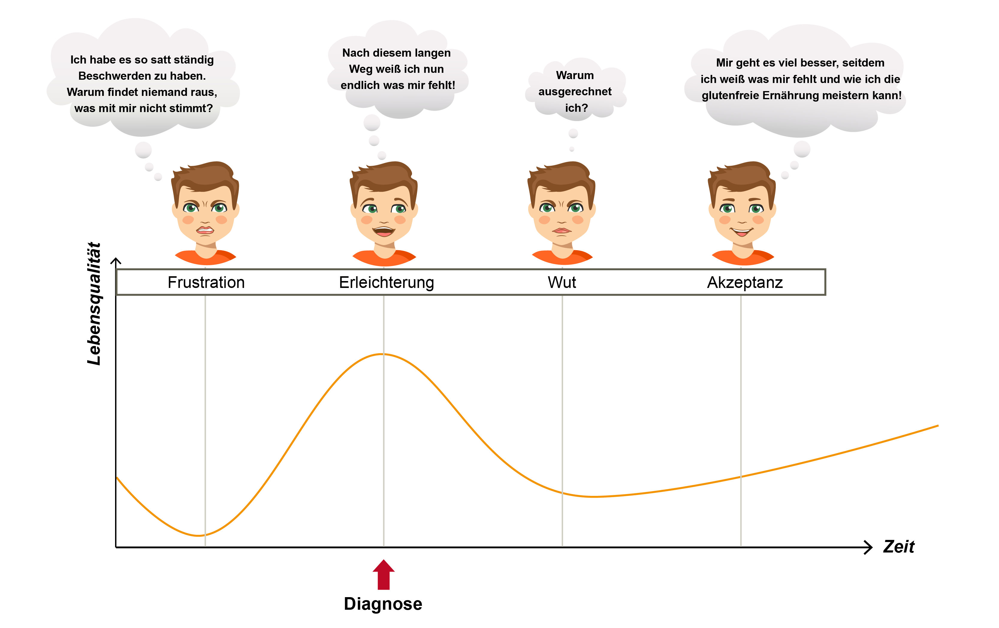 Vor der Diagnose fragen sich viele Betroffene, was die Ursache ihrer teils seit langem bestehenden gesundheitlichen Beschwerden ist. Manche haben vielleicht auch schon einen Spießrutenlauf an Arztbesuchen, Untersuchungen und Behandlungsversuchen hinter sich. Wenn endlich die Diagnose Zöliakie ausgesprochen wird, fühlen sich die meisten zunächst erleichtert (siehe Abbildung 1). Endlich kennen sie den Grund für Ihre Symptome. Die Umstellung auf eine streng glutenfreie Ernährung kann in diesen Fällen oft besser akzeptiert werden, vor allem, wenn sich die Person dadurch schnell besser fühlt. Auch das Wissen, dass die Behandlung keine Medikamenteneinnahme oder Operationen erfordert, macht es für viele einfacher.