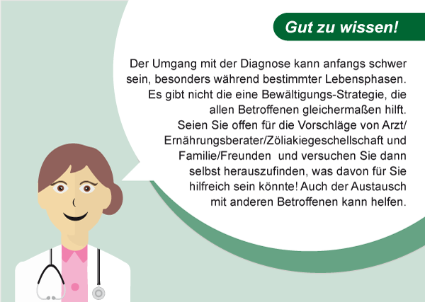 einen offenen Umgang mit Zöliakie zu entwickeln, selbstbewusst mit dem persönlichen Umfeld darüber zu sprechen und seine Interessen und Bedürfnisse zu vertreten