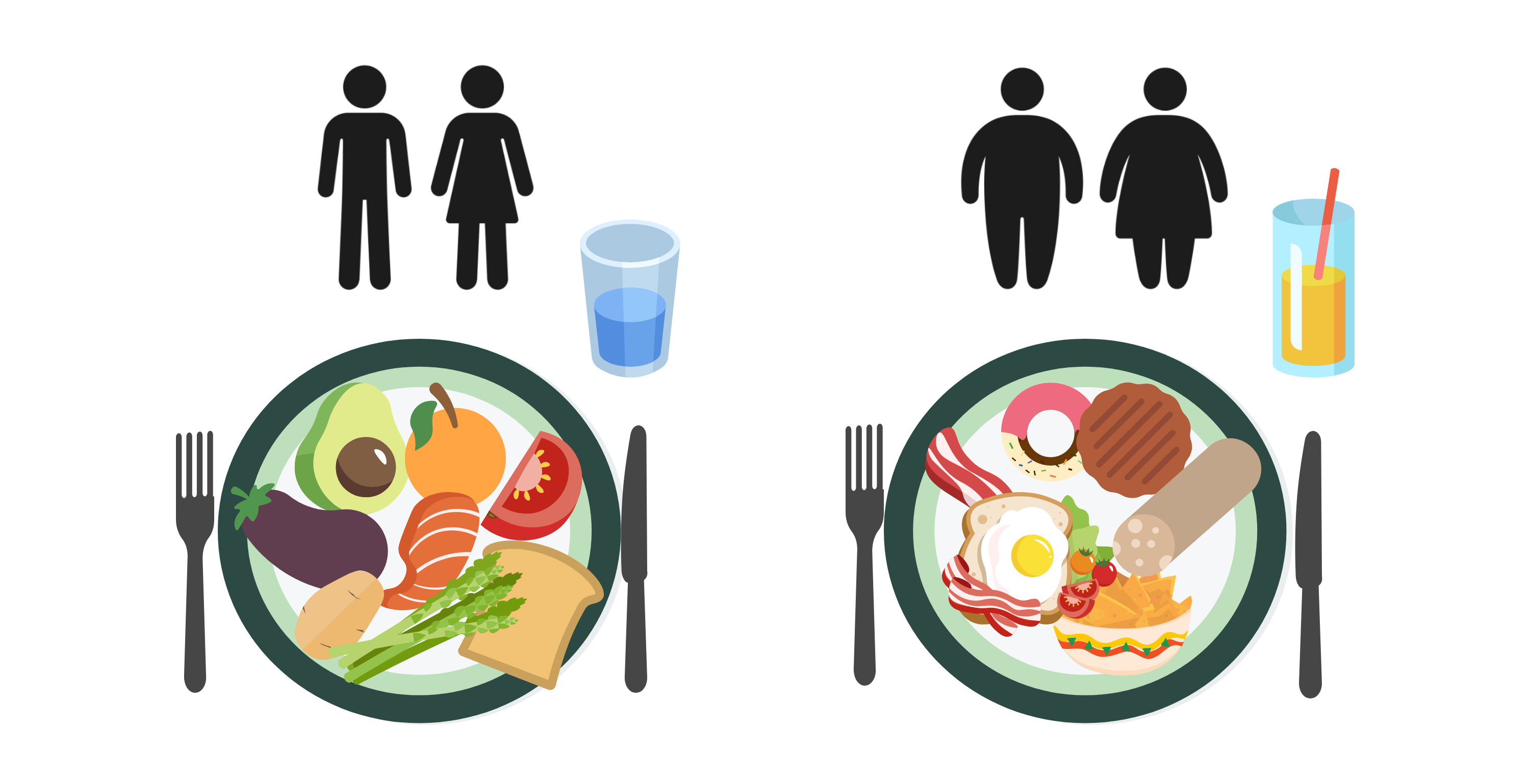 Abbildung 9: Typische Auswahl an Lebensmitteln einen schlanken Person (links) und einer Person mit Übergewicht (rechts) (Quelle: FocusINCD)
