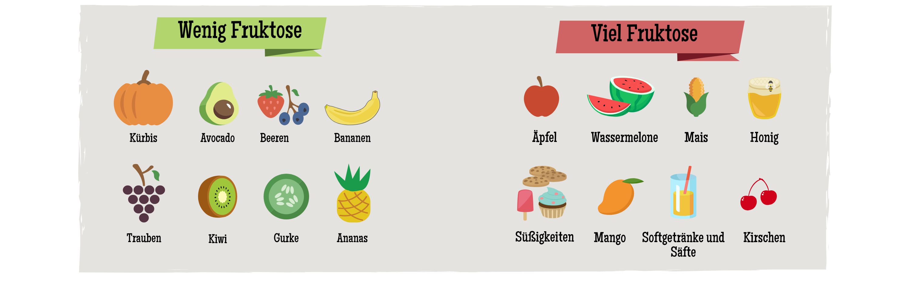 Bei Verdacht auf Fruktosemalabsorption sollte parallel zur glutenfreien Ernährung zunächst für etwa einen Monat komplett auf fruktosehaltige Lebensmittel verzichtet werden. In dieser Zeit kann der Darm sich besser erholen. Dann können leicht verdauliche fruktosehaltige Lebensmittel langsam wieder „ausgetestet“ werden, um herauszufinden wo die individuelle Verträglichkeit liegt. Obstsorten mit sehr hohem Fruktoseanteil sollten nur in kleinen Mengen und zusammen mit anderen Mahlzeiten gegessen werden. Bestimmte Obstsorten enthalten ohnehin nur wenig Fruktose und werden deshalb meist gut vertragen (Abbildung 14). Wenn gleichzeitig größere Mengen an Glukose (zum Beispiel in Form von Traubenzucker) aufgenommen werden, begünstigt das außerdem die Aufnahme von Fruktose in die Darmzellen. So kann ein Obstkuchen beispielsweise mit Traubenzucker, statt mit normalem Haushaltszucker zubereitet werden, um die Aufnahme der Fruktose und damit die Verträglichkeit zu verbessern.